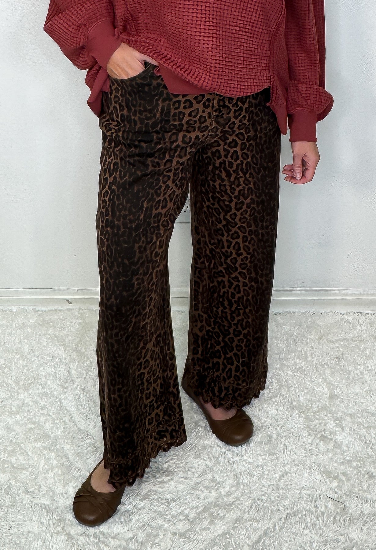 Turn heads with our Midnight Safari Crop Leopard Denim—your new go-to for bold style with a boutique twist. These striking leopard print jeans feature a high-rise waist and cropped wide-leg silhouette, finished with delicate scalloped lace at the hem for a playful yet polished look.
